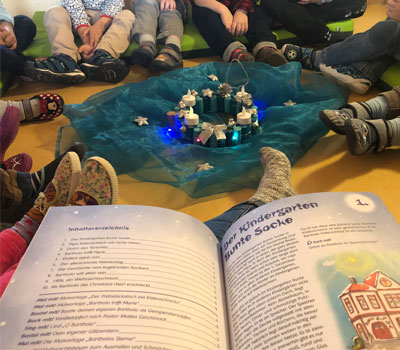 "Jeden Tag setzen wir uns gemütlich in einen Sitzkreis, zünden unsere Kerze an und lesen die Geschichte. Anschließend wird immer ein Namenszettel gezogen.