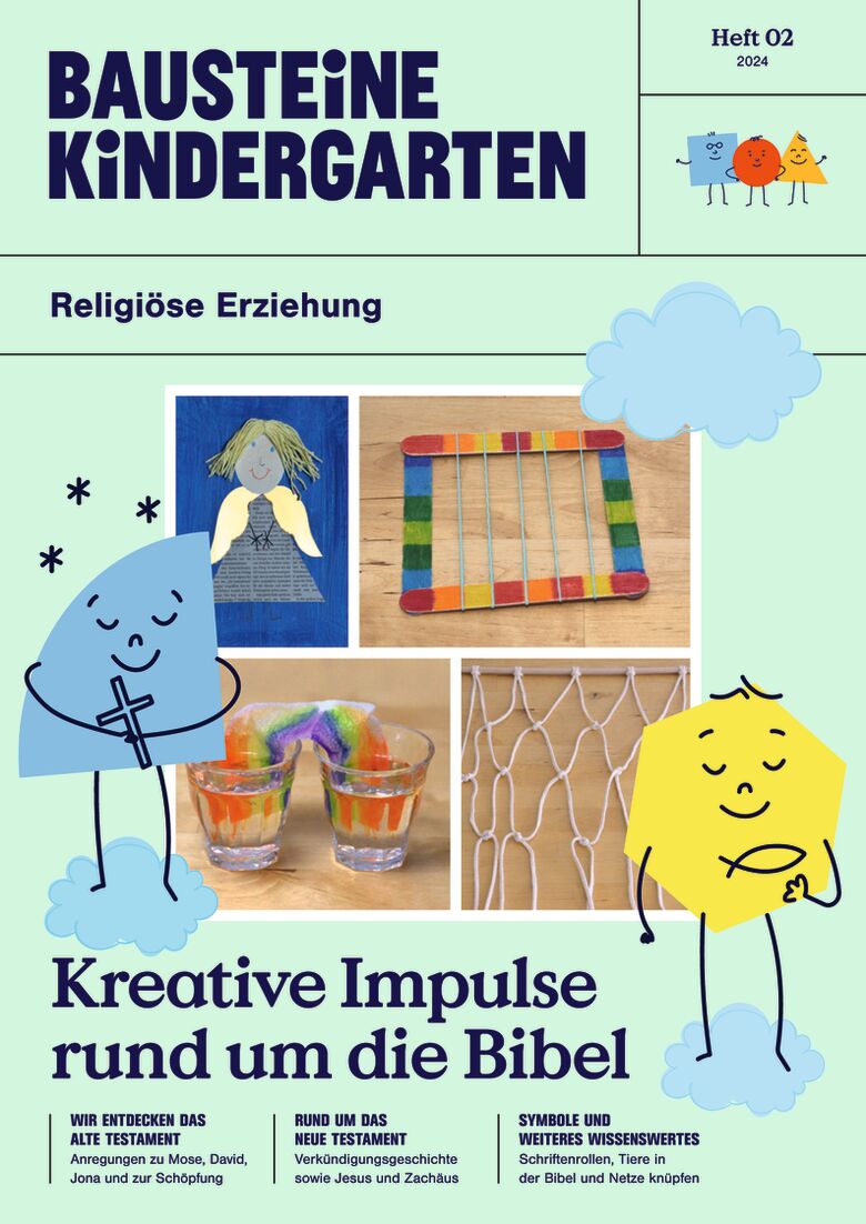 Im ersten Baustein gibt es Impulse zum Alten Testament. Zur Schöpfungsgeschichte, zu Mose, David und Jona finden sich vielfältige Anregungen wie das Pflanzen eines kleinen Gartens im Joghurtbecher, ein Lied, ein Experiment zum Regenbogen, das Anfertigen von Schrifttafeln aus Ton, eine Klanggeschichte, der Bau einer Harfe aus Holzspateln und Vorlagen für ein eigenes Bilderbuch.