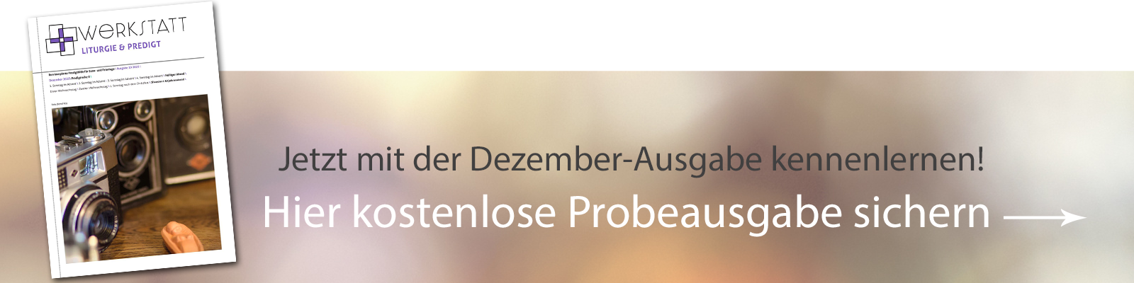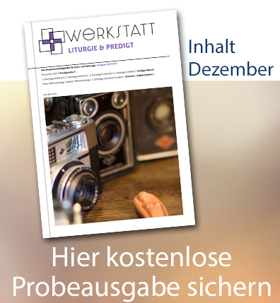 Bei den täglichen Herausforderungen ist die Zeit manchmal knapp oder Sie können einen inhaltlichen Impuls gebrauchen? Egal, was. Mit der WERKSTATT Liturgie & Predigt erhalten Sie für jeden Sonn- und Feiertag einen Predigtvorschlag und ein Bildbetrachtung – komplett ausgearbeitet und sofort einsetzbar. Sie entscheiden selbst, was Sie brauchen. Alle Inhalte erhalten Sie – neben dem gedruckten Heft – auch digital. Somit können Sie die Texte nach herzenlust (ver-)ändern und so nutzen, wie es Ihre individuelle Situation gerade erfordert.